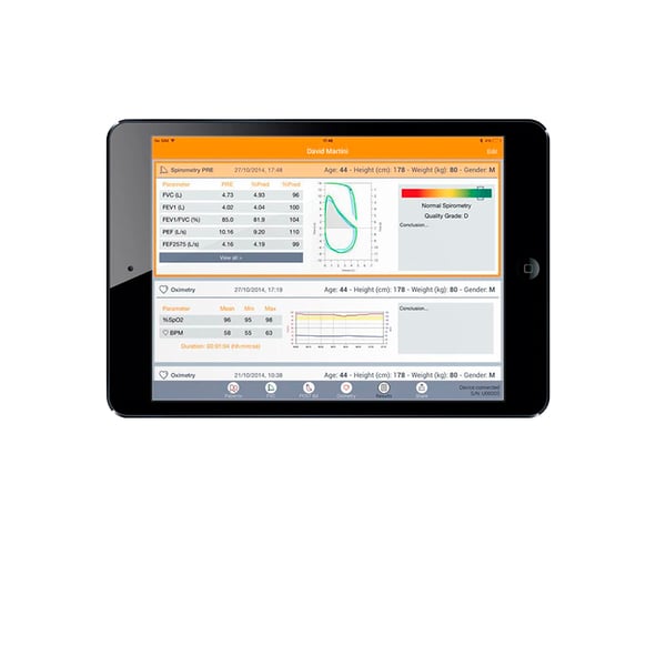 Spirobank II Smart spirometer with software that allows connection by cable (USB 2.0) or wirelessly via Bluetooth 4.0 . It is designed with a wide range of parameters and has a capacity for 10,000 tests .