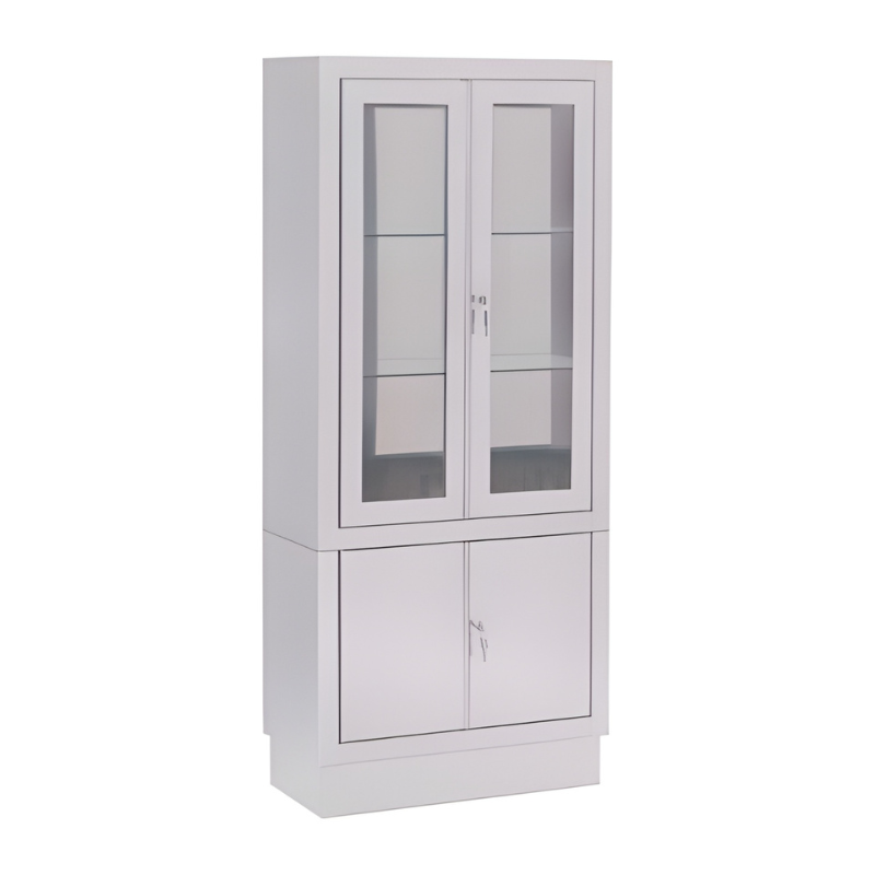 Its design combines upper glass doors for viewing the contents and a closed lower compartment for protected storage.