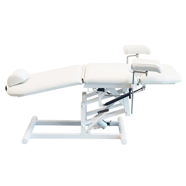 This three-section hydraulic gynecological examination chair or stool with a cervical cushion and adjustable height, backrest from 0° to 85° and footrest from -90° to 10°, also offers high-density upholstery and a fire-resistant M2 synthetic leather finish.
