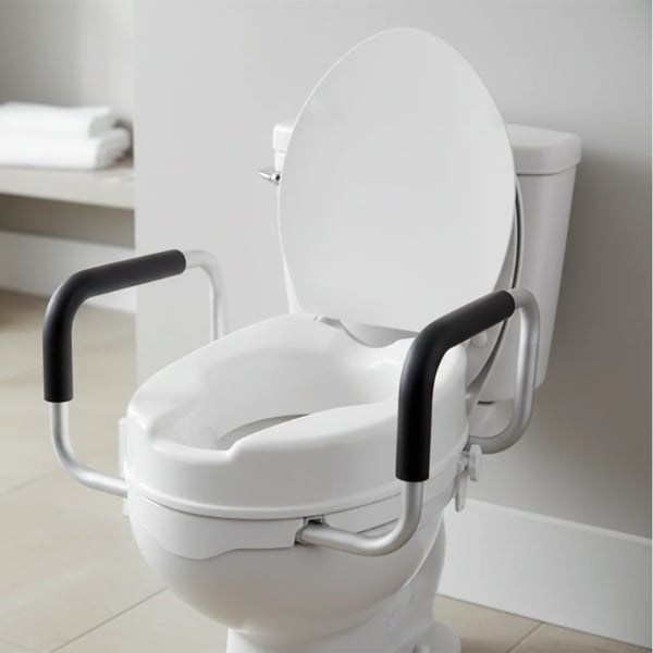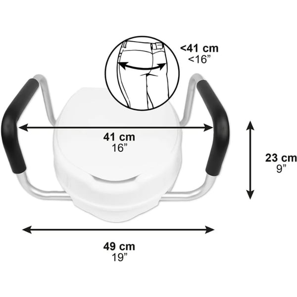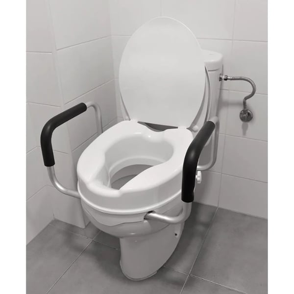 The KMINA 10cm toilet seat riser with armrests is designed to make toilet use easier for people with reduced mobility , the elderly, or those undergoing rehabilitation . Its ergonomic design with padded armrests provides greater stability and reduces effort when sitting down or standing up, improving the user's independence in the bathroom.