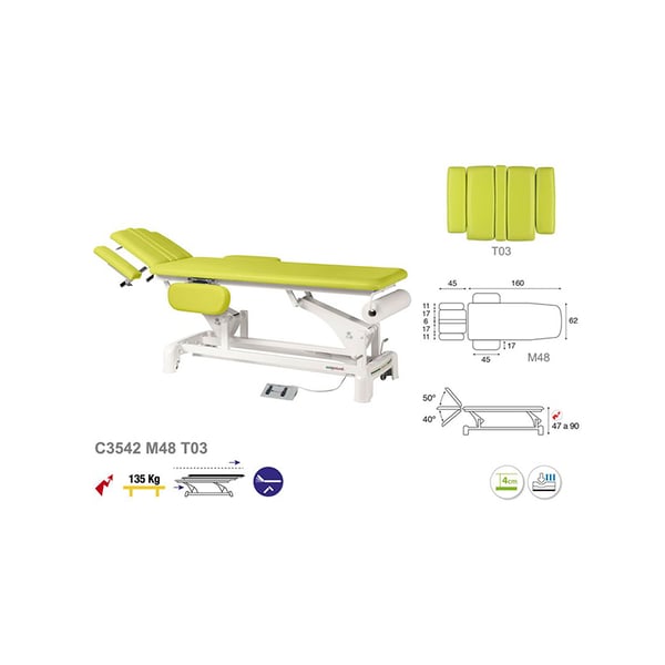 New electric stretcher of Ecopostural technical modality, composed of two bodies and with an electric lifting system . It consists of a steel structure with connecting rods with bearings and retractable wheels that facilitate lateral movement. It has a foam padding of various thickness levels and M2 class upholstery. In addition, it has a tilting headrest, with a face plug and fan-shaped arms that provide greater comfort for both the professional and the patient.