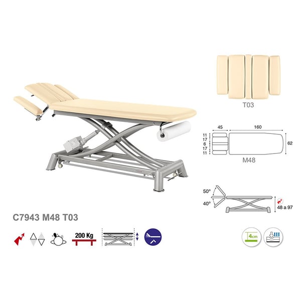 Electric stretcher with two columns, two sections and vertical elevation with a headrest that can be reclined up to 90º with a roll holder included. It has a simple, modern and functional design. Another of the great advantages that the stretcher offers is its versatility, as it is ideal for numerous fields: physiotherapy, osteopathy, general medicine, aesthetics, tattoos. A perfect solution for any health and aesthetics professional.